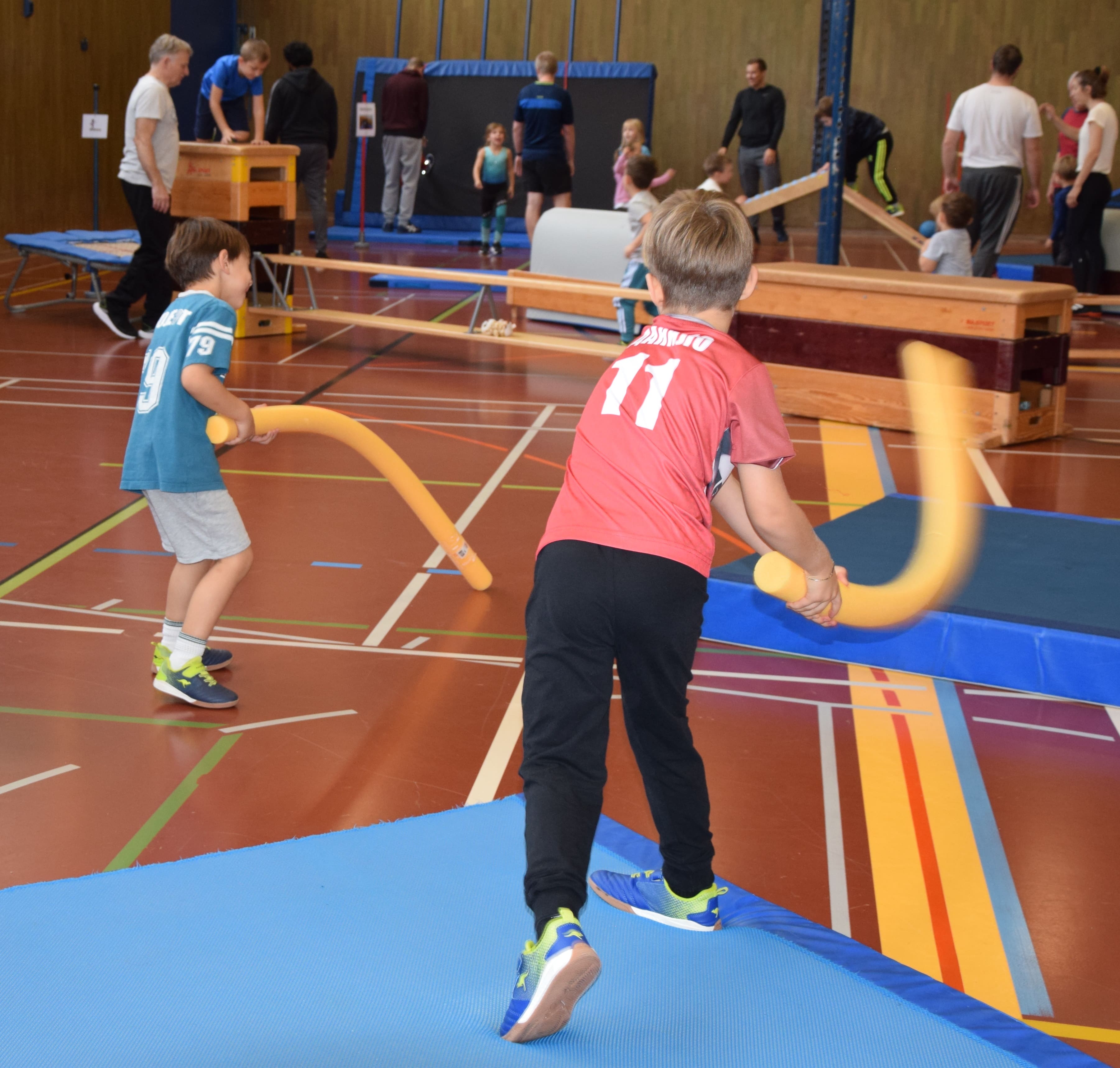 Einmal mehr hatte das KITU -und MUKI-Team mit Claudia Enz (KITU-Hauptleiterin) und Marcela Bucher (MUKI-Hauptleiterin) sowie ihren Helferinnen Nicole Holzmann und Natalie Cazzillo tolle Stationen zum Thema „Herbst“ aufgestellt. Nach den Begrüßungsworten von Claudia Enz und der FTV-Präsidentin Ursula Hunkeler sowie dem gemeinsamen Einturnen mit den Vätern waren die Kinder nicht mehr zu halten. Schnell verteilten sich alle an die einzelnen Posten. Jede hatte ihre Tücken: Kraft beim Klettern, Mut bei der Gletscherspalte, Treffsicherheit beim Unihockeyspiel und vieles mehr. Hit war der Boxsack mitten in der Turnhalle auf den die Kinder mit den Boxhandschuhen und mit vollen Kräften reinschlagen konnten. Aufgestaute Energie ade! Ein leicht gestresster Vater meinte neben der Station: „Mein Sohn hat so viel Energie, dies tut ihm gut“. Beliebt waren auch die Rutschbahn, der Kletterpark und das Tauschwingen von Step zu Step, das Fechten mit den Poolnudeln sowie die Langbank-Schaukel.