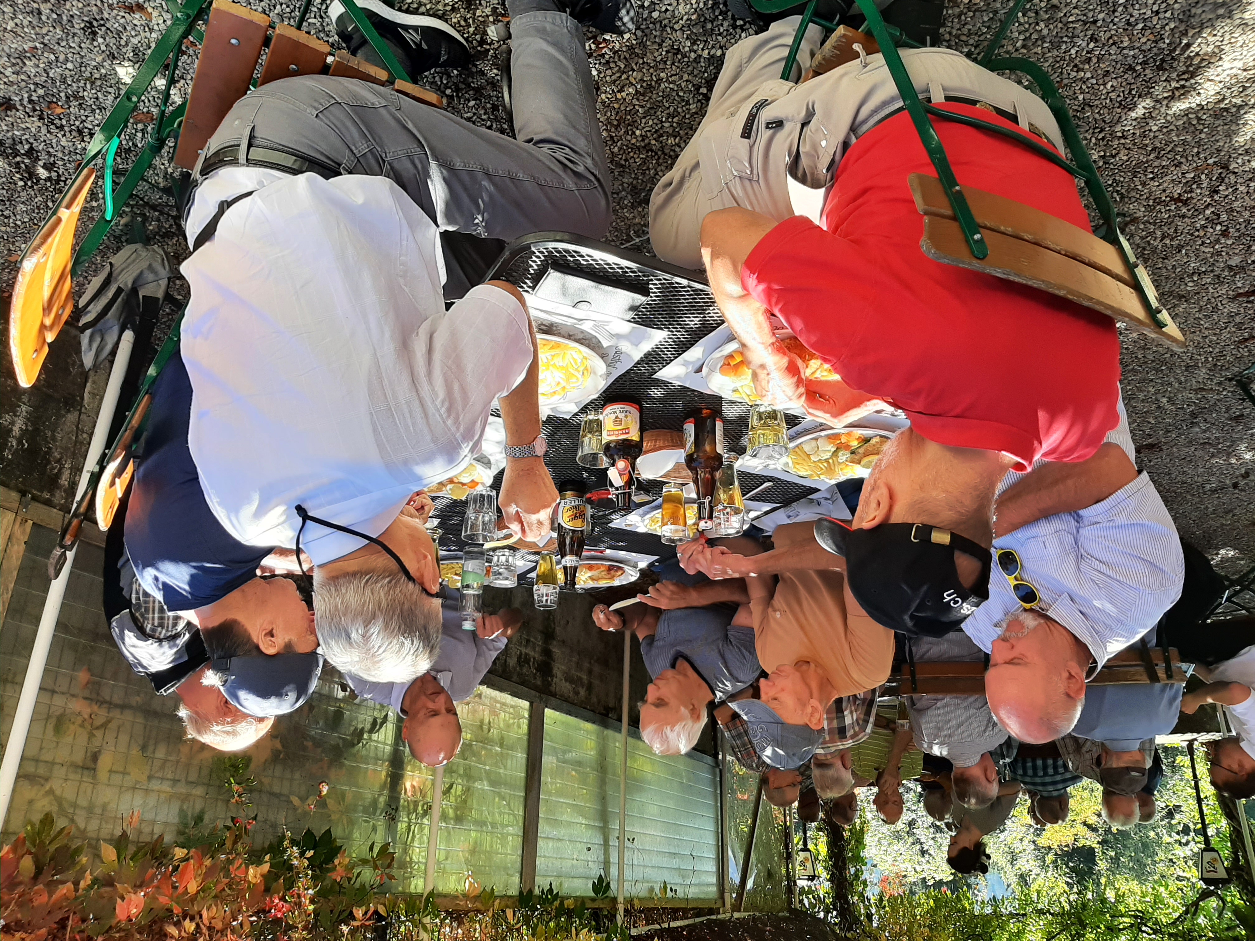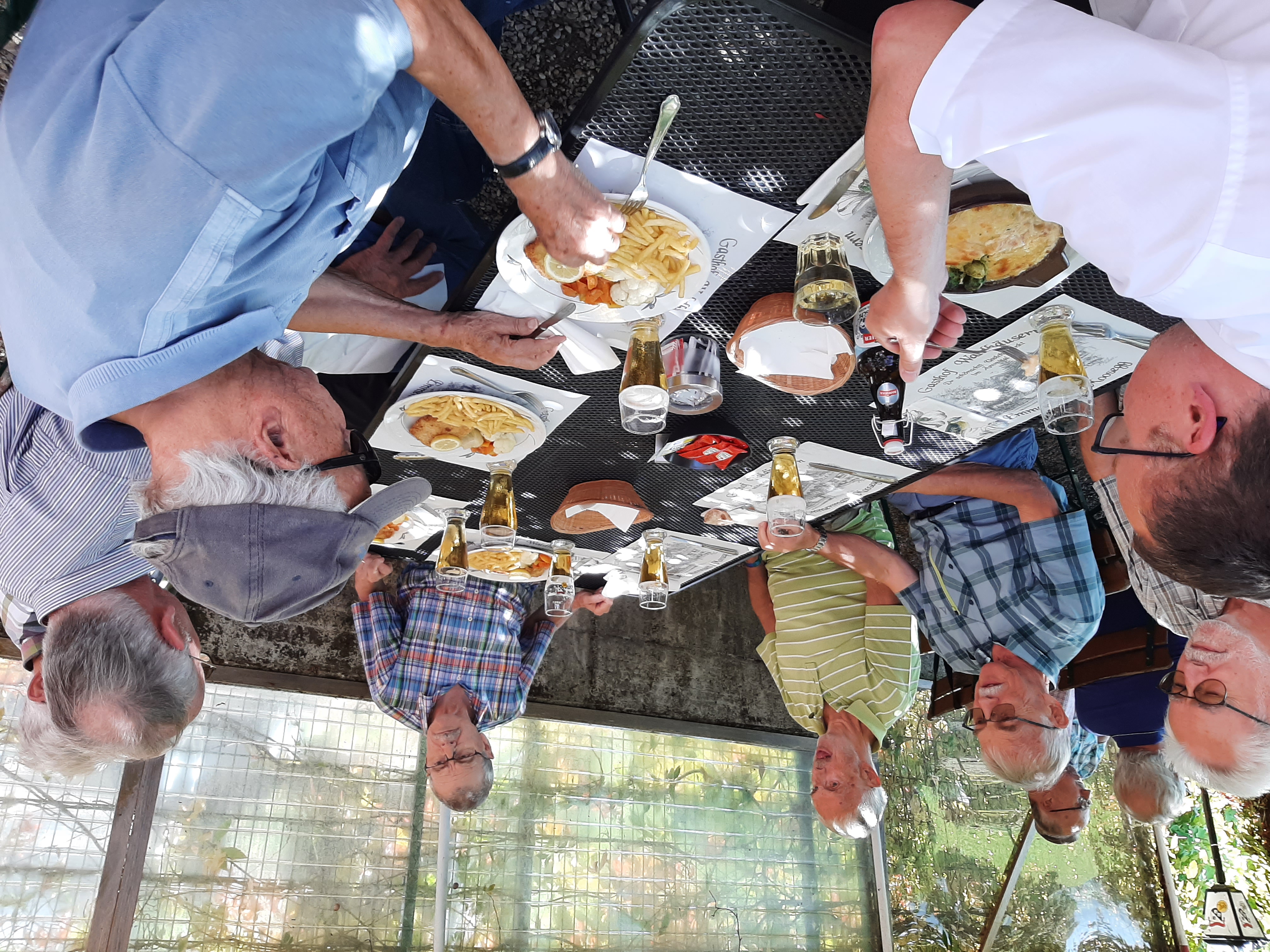 Dann gings weiter bei strahlendem Sonnenschein mit dem Car über Huttwil, Sumiswald, Ramsei – vorbei am Stammhaus von Ramseier – ins für die meisten unbekannte Emmental. Das Ziel war die Moosegg auf knapp 1000 müM. Im Weiler Waldhäusern war beim alten Kurhaus schon aufgetischt. In der Gartenwirtschaft bei herrlichem Blick in die Berner Viertausender freuten wir uns aufs Mittagessen. Mit gemischtem Salat, Cordonbleu, Pommes, Gemüse konnten wir unseren Hunger stillen. Nach dem ausgezeichneten Mal wurde uns zum Abschluss eine Meringue serviert, welches unsere ‘Geburtstagskinder’ Bruno und Ruedi mit einem Schuss Gebranntem ergänzten.
